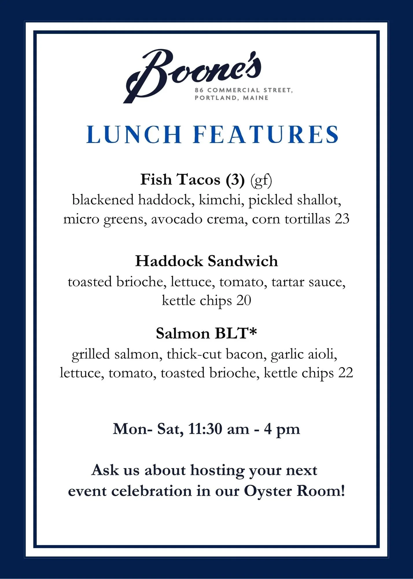 Blackened Haddock Tacos, Oysters, Salmon BLT and more!